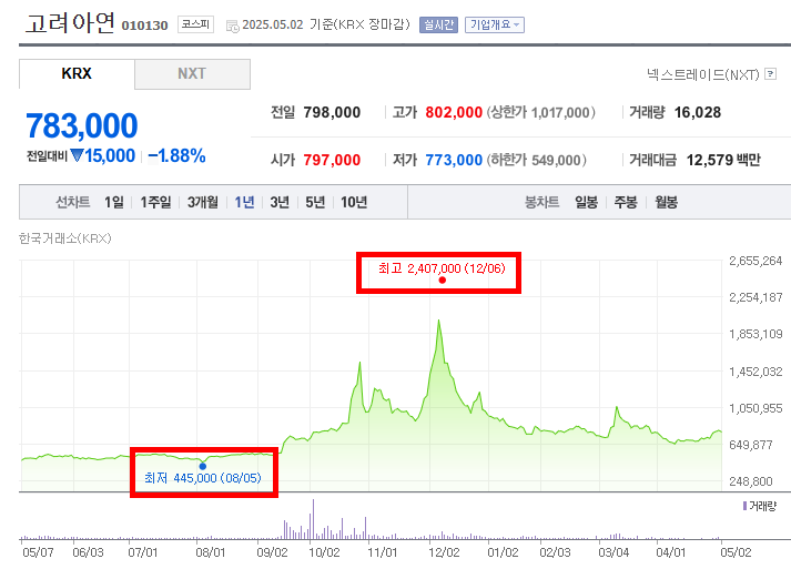 2024년 12월 초 최고점을 기록한 이후 고려아연의 주가는 급격하게 하락하는 모습을 보였다. 2025년 2월까지 상당 폭 하락했으며, 이후에도 등락을 반복하며 하락 추세를 이어갔다. 5월 2일 종가는 783,000원으로 최고가 대비 크게 하락한 수준이다. 이 하락 구간은 급등에 대한 차익 실현 매물의 출현, 아연 가격 하락, 또는 기업의 실적 둔화 우려 등 다양한 요인에 의해 발생했을 가능성이 있다.
