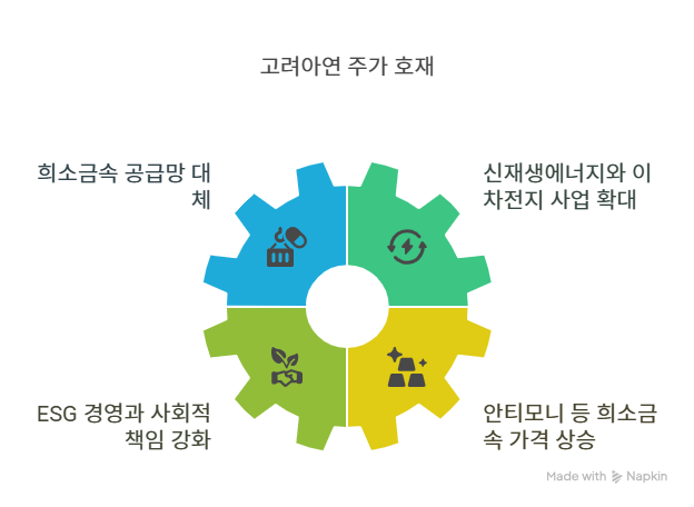 트럼프 2기 행정부의 전 세계 수입품 대상 관세 부과 정책은 고려아연에 리스크로 작용한다. 2025년 2월 아시아경제 보도에 따르면, 인듐과 비스무트는 현재 관세 부과 가능성이 낮지만, 금속 품목이 향후 대상에 포함될 경우 수출 경쟁력이 약화될 수 있다. 고려아연은 미국 시장에서 희소금속 수출 비중이 크며, 관세 부담은 수익성에 직접적인 영향을 미친다. 글로벌 공급망 재편 속에서 중국의 수출 통제가 호재로 작용하지만, 미국의 보호무역주의는 중장기적으로 불확실성을 더한다.