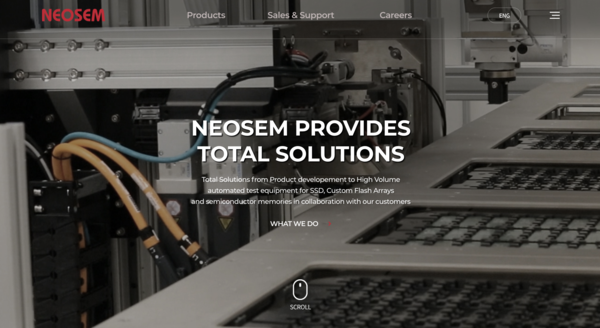 - 반도체 테스트 장비는 네오셈의 핵심 사업으로, 메모리 테스트 시스템, SOC 테스트 시스템, 테스트 핸들러를 포함한다. 메모리 테스트 시스템은 SSD(Solid State Drive)와 DRAM의 성능·신뢰성을 검사 5세대 SSD 테스터는 네오셈이 글로벌 시장 1위를 유지하는 제품이다. SOC 테스트 시스템은 시스템반도체의 복잡한 기능을 검증하며, 테스트 핸들러는 자동화된 검사 공정을 지원한다. 2024년 CXL(Compute Express Link) 메모리 검사 장비와 서버 DIMM(Dual In-line Memory Module) 테스터로 사업을 다변화하며 데이터센터 수요에 대응한다.