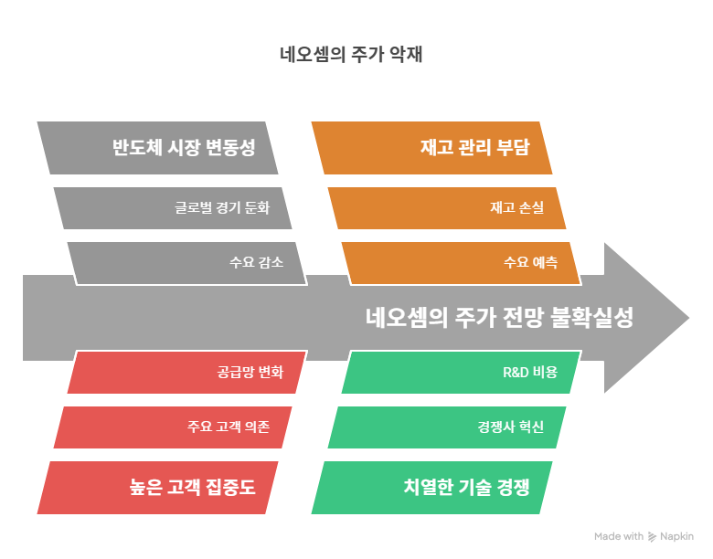 네오셈은 반도체 테스트 장비 전문 기업으로, 글로벌 반도체 업황의 변동성에 민감하다. 2020년 더벨 보도에 따르면, 2019년 반도체 테스터 업황 부진으로 네오셈은 설립 후 처음으로 영업손실 33억 원을 기록했다. 2025년 디일렉 보도에서도 노트북, 스마트폰용 레거시 D램 시장의 수요 감소가 언급되었다. 이는 네오셈의 SSD 테스터 매출에 부정적인 영향을 미칠 가능성이 있다. 비록 서버용 DIMM과 CXL 테스터 수요가 증가하고 있지만, 글로벌 경기 둔화와 반도체 수요 불확실성은 네오셈의 매출 안정성에 리스크로 작용한다.