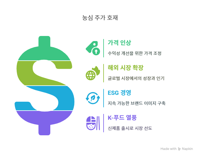 - 최근 2025년 5월 16일 기사에 따르면, 농심은 2분기 실적 기대감과 내수 가격 인상, 미국 시장 진출 계획 등으로 주가가 9.4% 상승하며 45만 4,000원에 거래되었다. 이는 배당금 외에도 주주환원에 대한 기대가 반영된 결과로 보인다.