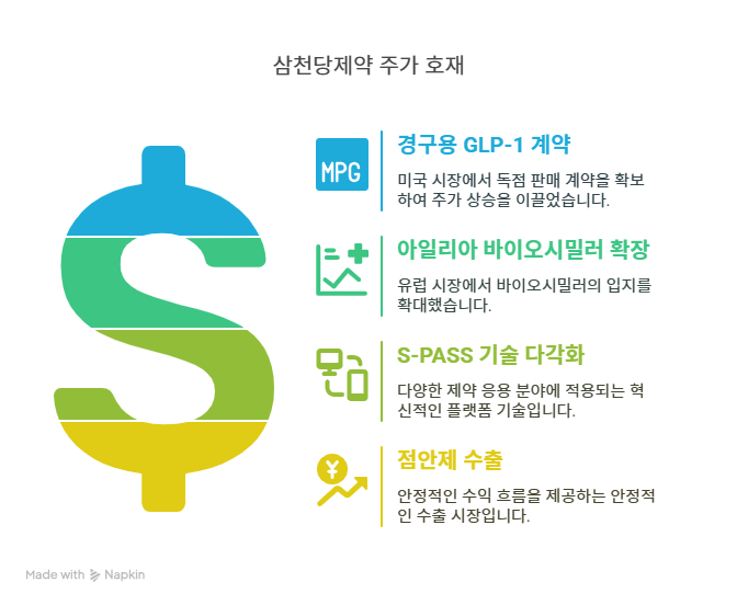- 넷째, 제네릭 의약품, 특히 경구용 세마글루타이드(리벨서스 제네릭)는 새로운 수익원으로 주목받는다. 2026년 물질 특허 만료 후 S-PASS 기술로 시장 선점이 기대되며, 생동성 시험 진행으로 2025년 주가가 5.47% 상승했다. 삼천당제약은 현금성 자산 1055억 원(2024년)을 바탕으로 R&D와 글로벌 확장을 통해 수익성을 강화한다.