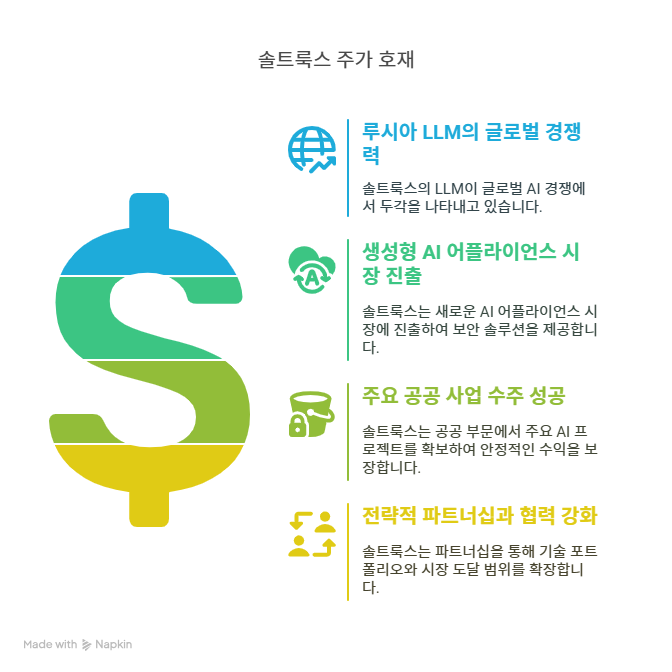 - 2025년 전망으로는, 솔트룩스가 생성형 AI 솔루션 ‘루시아’와 ‘루시아온’을 통해 공공 및 민간 시장에서 수주를 확대하고 있으나, 공공 사업 의존도와 경쟁 심화로 수익성 개선이 과제다. 배당 정책에 대한 공식 발표는 확인되지 않았다.