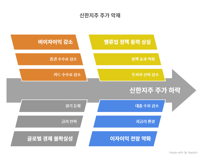 신한지주의 주가 상승을 견인했던 밸류업(기업가치 제고) 정책이 최근 동력을 잃고 있다. 2025년 4월 기사에 따르면, 밸류업 정책의 효과가 약화되며 금융주 전반의 주가 상승세가 주춤하고 있다. 이는 신한지주의 주가에도 부정적인 영향을 미치며, 투자자들의 기대감을 낮추고 있다. 또한, 밸류업 정책의 불확실성은 신한지주의 중장기 성장 전략에 대한 시장의 신뢰를 약화시킬 가능성이 있다. 이를 극복하기 위해서는 새로운 성장 동력이 필요하다.