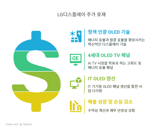 - 2025년 전망으로는, LG디스플레이가 청색 인광 OLED 패널 제품화 성공(2025년 5월 1일 뉴스룸)과 차량용 디스플레이 및 게이밍 OLED 사업 확대로 수익성을 개선하고 있다. 그러나 감가상각비 부담(2025년 4조 3,000억 원 예상)과 전기차 시장 불확실성 등으로 배당 재개 여부는 불확실하다.