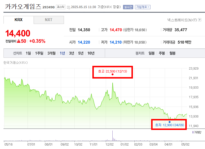 - 종합적으로 분석했을 때, 카카오게임즈의 주가는 2024년 중반까지 하락세를 보이다가 연말에 일시적인 급등을 경험했으나, 이후 다시 하락하여 2025년 4월에 최저점을 기록하는 등 전반적으로 하락 추세가 우세했던 기간이라고 평가할 수 있다.