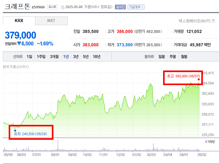 - 요약하자면, 해당 기간 동안 크래프톤의 주가는 2024년 5월 말 최저점을 기준으로 꾸준한 상승세를 나타냈으며, 중간중간 조정을 받는 구간이 있었으나 전반적인 상승 추세는 뚜렷하게 유지되었다. 2025년 5월 초 최고점을 기록한 이후 현재까지는 하락하는 모습을 보이고 있다.