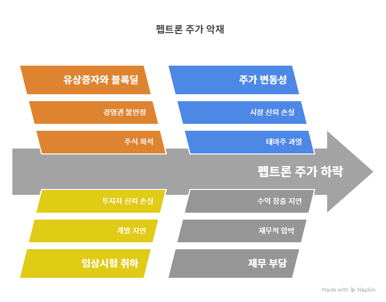 2025년 4월 18일, 펩트론은 파이프라인 PND3174의 제1a상 임상시험계획을 자진 취하했다고 공시했다. 이는 임상 개발 과정에서 예상치 못한 문제나 전략적 우선순위 변경으로 해석된다. 임상 취하는 투자자들에게 개발 지연이나 실패 위험으로 비춰지며, 주가에 부정적 영향을 미친다. 특히, 펩트론의 주요 파이프라인에 대한 신뢰도가 흔들릴 가능성이 있다. 구체적인 취하 사유가 명확히 공개되지 않아 불확실성이 가중되고, 이는 단기적으로 주가 안정성에 악재로 작용한다.
