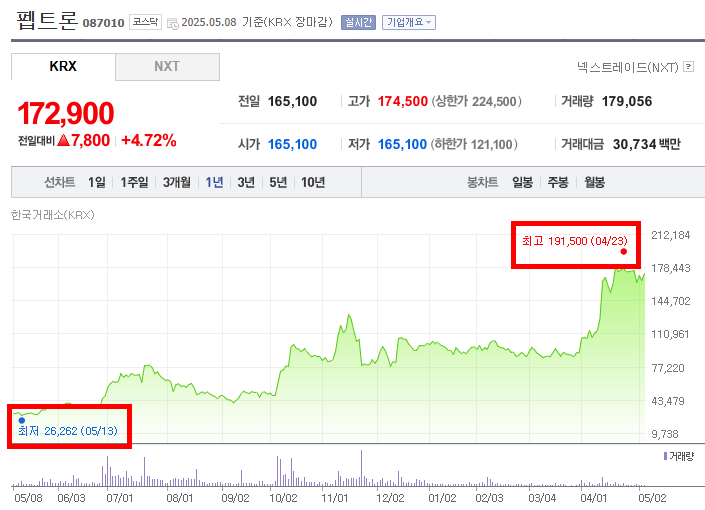 👇👇펩트론 실시 주가 변동은 아래 링크를 통해 확인할 수 있습니다.👇👇
