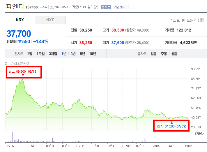 - 결론적으로, 피엔티의 주가는 해당 기간 동안 2024년 6월 중순에 최고점을 기록한 후 장기간에 걸쳐 하락하는 추세를 보였으며, 2025년 4월 초에 최저점을 기록한 후 소폭 반등하는 움직임을 나타냈다.
