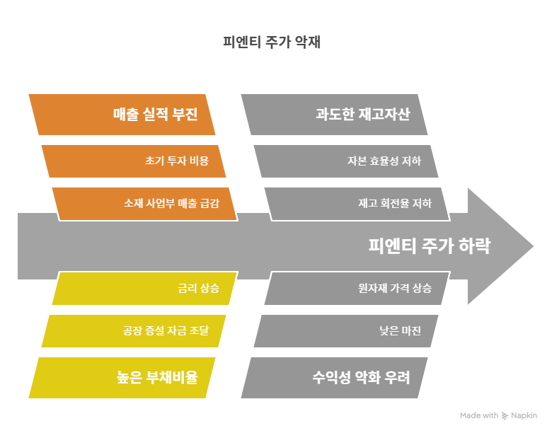 2025년 1분기 분기보고서 발표 후 피엔티 주가는 급락했다. X 게시물에 따르면, 소재 사업부 매출이 급감하며 전체 매출 실적이 시장 기대치를 밑돌았다. 이는 단기적인 수익성 악화 우려를 낳았다. 특히, 소재 사업의 초기 투자 비용이 매출로 전환되지 못하며 수익 구조에 부담을 주고 있다. 이는 투자자들의 단기 기대 심리를 약화시키며 주가 변동성을 키운다.