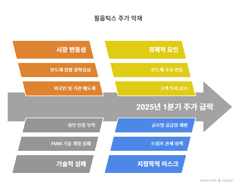 필옵틱스는 2025년 1분기 주가 급락으로 투자자 우려를 낳았다. 2025년 3월 이코노뉴스 보도에 따르면, 3월 19일 주가가 6.53% 하락해 4만800원에 거래되었다. 3월 10일부터 17일까지 11% 미만의 상승 후, 18일 1.91% 하락에 이어 추가 낙폭을 기록했다. 이는 코스닥 시장의 외국인과 기관 매도세 영향과 반도체 업황 불확실성 때문으로 분석된다. 주가 변동성은 필옵틱스의 단기 투자 매력을 약화시키며, 시장 신뢰도 회복에 시간이 필요하다. 이러한 급락은 유리기판 장비 개발의 긍정적인 모멘텀에도 불구하고 단기적인 수급 불균형으로 인해 투자 심리에 부정적인 영향을 미친다.