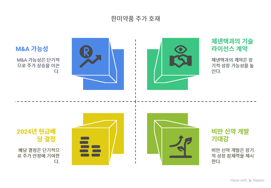 2024년 1월, 한미약품과 OCI 간의 통합 논의가 주가 상승을 이끌었다. M&A 발표 당일 주가는 35만 3,000원까지 급등하며 시장의 높은 기대를 반영했다. 비록 이후 주가가 27만 7,000원으로 하락했지만, M&A는 한미약품의 사업 확장과 시너지 창출 가능성을 보여준다. 이는 회사의 시장 점유율 확대와 자원 통합을 통해 중장기적인 성장 동력을 확보할 수 있는 기회로 평가된다. M&A를 통한 구조적 변화는 한미약품의 경쟁력을 강화할 가능성을 제시한다.