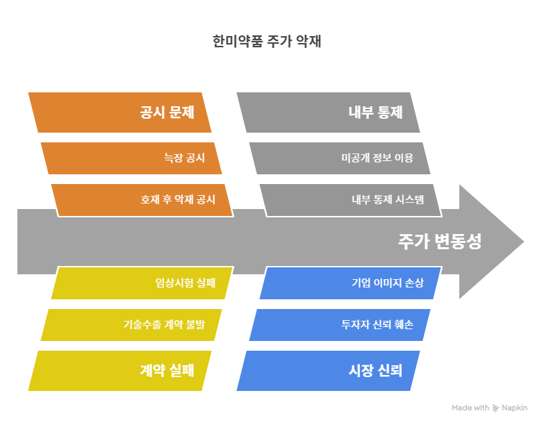 2016년 9월 30일, 한미약품은 제넨텍과의 기술수출 호재 공시 직후, 독일 베링거인겔하임과의 ‘올무티닙(올리타)’ 라이선스 반환이라는 악재를 공시했다. 이로 인해 주가가 18.06% 급락하며 연중 최저치인 50만 8,000원을 기록했다. 이러한 시간차 공시는 투자자 신뢰를 훼손하며 주가 변동성을 초래했다. 특히, 호재 공시로 주가가 상승한 직후 악재 공시로 급락하면서 투자자들의 손실이 컸다. 이는 한미약품의 공시 관리 체계에 대한 비판으로 이어졌다.