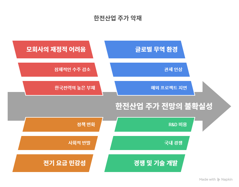 한전산업은 모회사 한국전력(한전)의 재무 위기로 간접적인 영향을 받고 있다. 2025년 5월 한국NGO신문에 따르면, 한전은 누적 영업적자 30조 원, 총부채 200조 원을 초과하며 심각한 경영난을 겪고 있다. 한전은 2025년 1분기 영업이익 3조 7536억 원을 기록했으나, 이는 전기요금 인상에 따른 수익 확대에 의존한 결과로 근본적인 재무 구조 개선은 미흡하다. 한전의 자회사인 한전산업은 한전의 재무 부담이 수주 감소나 자금 지원 축소로 이어질 가능성을 배제할 수 없다. 이는 한전산업의 성장 전망에 불확실성을 더한다。