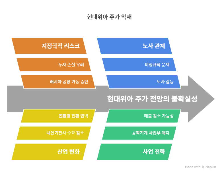 현대위아는 러시아-우크라이나 전쟁으로 러시아 엔진공장 가동이 2022년 4월부터 중단된 상태다。2023년 잡코리아 보고서에 따르면, 2021년 9월 준공한 러시아 공장은 6개월 만에 생산을 멈췄으며, 러시아 정부의 자산 몰수 정책으로 투자 비용 회수가 어려워졌다。2022년 분기당 90~100억 원에 달하던 고정비용은 2023년 1분기 60억 원으로 줄었지만, 여전히 재무 부담으로 작용한다。현대차그룹의 러시아 철수 가능성이 제기되며 자산 매각의 불확실성도 커졌다。이러한 지정학적 리스크는 현대위아의 해외 사업 확장 전략에 제약을 가하며, 단기적으로 실적에 부정적 영향을 미친다。