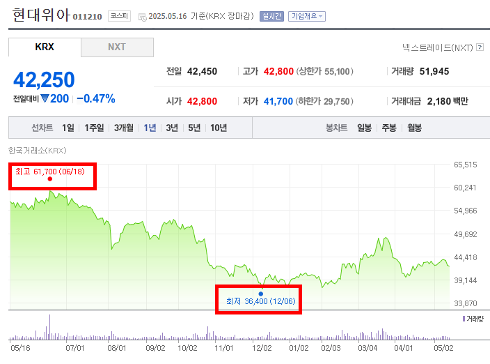 • 요약하자면, 해당 기간 동안 현대위아의 주가는 2024년 상반기에는 하락세를 지속하다가 12월 초 최저점을 기록한 후 2025년 상반기에는 상승하는 흐름을 보였다. 최고점에서 최저점까지 큰 폭으로 하락한 이후, 상당 부분 회복하는 모습을 나타낸다.
