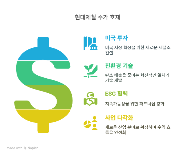 현대제철은 미국 남동부 루이지애나 주에 자동차강판 특화 전기로 제철소를 건설하며 외형 성장을 추진한다. 2025년 3월 매일경제 보도에 따르면, 하나증권은 이 대규모 투자로 현대제철의 중장기 탄소저감 체제 전환과 보호무역주의 대응이 가능하다고 평가하며, 투자의견 ‘매수’와 목표주가 4만3000원을 유지했다. 이 제철소는 2028년 가동을 목표로 하며, 북미 자동차 시장의 수요를 충족시킬 예정이다. 현지 생산을 통해 관세 리스크를 줄이고, 현대차그룹의 북미 전기차 생산 확대에 맞춘 강판 공급을 강화한다. 이는 현대제철의 글로벌 시장 점유율 확대와 매출 성장 가능성을 높이며, 장기적인 수익성 개선으로 이어질 전망이다.