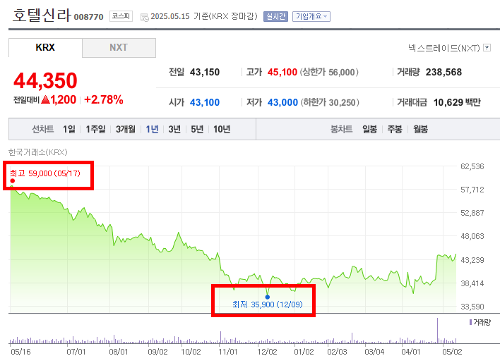 - 결론적으로, 호텔신라의 주가는 해당 기간 동안 2024년 5월 중순에 최고점을 기록한 이후 지속적인 하락세를 보이다가 2025년 3월 말부터 반등하는 모습을 나타냈다. 하지만 최고점 대비 여전히 낮은 수준에서 거래를 마감한 것으로 분석된다.