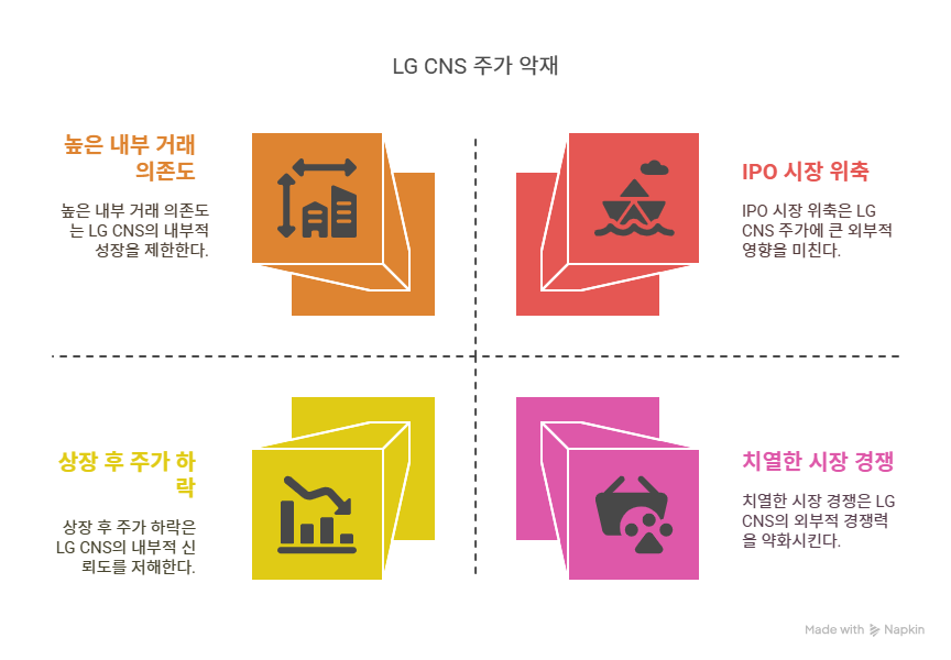 2025년 상반기 IPO 시장은 과열 논란과 함께 위축된 상태다. LG CNS를 포함해 상장 후 공모가를 하회하는 종목이 전체의 71%에 달한다. 글로벌 금리 인상, 경제 성장 둔화, 지정학적 불확실성 등 외부 환경은 기업의 투자 심리를 위축시키고 있다. LG CNS의 주요 사업인 금융 DX와 공공 SI는 정부 정책과 산업 규제에 민감하다. 예를 들어, 데이터 프라이버시 강화나 공공 발주 감소는 매출에 직접적 영향을 미칠 수 있다. 또한, LG그룹 주요 자회사(LG화학, LG에너지솔루션)의 실적 부진은 LG CNS의 지분 가치와 그룹 내 자원 배분에 간접적 영향을 줄 수 있다. 이러한 외부 리스크는 LG CNS의 안정적 성장에 걸림돌이 될 가능성이 크다.