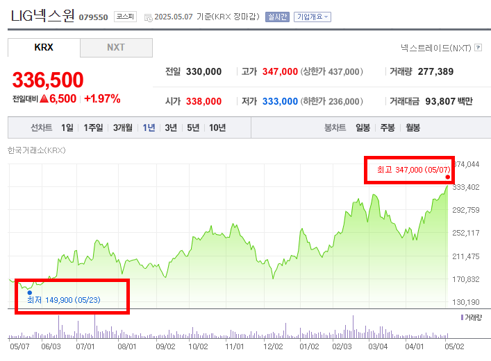 주가는 2024년 5월 하순 최저점을 기록한 이후 뚜렷한 상승세를 보였다. 5월 23일에 최저점인 149,900원을 기록한 이후 꾸준히 상승하여 2025년 5월 7일에는 최고점인 347,000원까지 상승했다. 이 구간은 약 1년 동안 지속적인 상승 추세를 나타낸다. 중간에 작은 폭의 조정은 있었으나, 전반적으로 우상향하는 흐름을 보였다. 특히 2024년 12월 이후 상승폭이 더욱 커지는 모습이다.