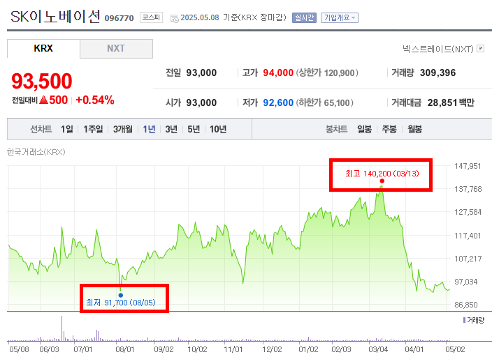 • 요약하자면, 해당 기간 동안 SK이노베이션의 주가는 2024년 여름에 최저점을 기록한 후 2025년 3월 중순까지 뚜렷한 상승세를 보였다. 이후 급격한 하락세로 전환되어 상승분을 상당 부분 반납하는 변동성이 큰 흐름을 나타냈다.