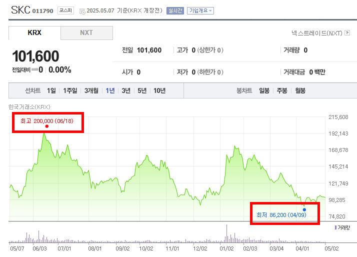 2024년 6월 중순 최고점을 기록한 이후 SKC 주가는 하락세로 전환되어 2025년 4월 9일에는 최저가인 86,200원까지 급격하게 하락했다. 이 하락 구간은 비교적 긴 기간 동안 지속되었으며, 상승분을 크게 반납하는 깊은 조정이었다. 특히 2024년 하반기 전반에 걸쳐 하락세가 뚜렷하게 나타났다. 2025년 4월 초 최저점을 기록한 이후 소폭 반등하는 모습을 보였으나, 5월 7일 종가는 101,600원으로 여전히 최고가 대비 낮은 수준이다.