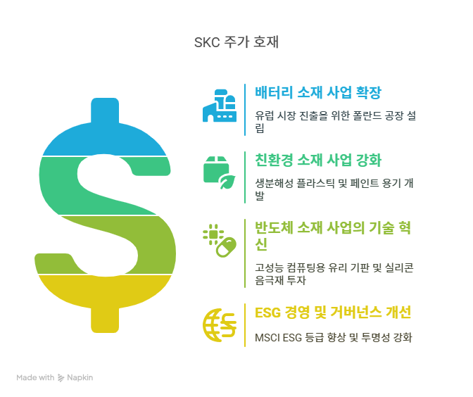 - SKC는 SK그룹 계열의 화학 및 소재 전문 기업으로, 이차전지, 반도체, 친환경 소재를 중심으로 한 고부가가치 소재 사업에 주력한다.