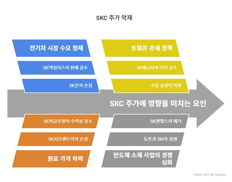 전기차 시장의 수요 정체는 SKC의 배터리 소재 사업에 악재로 작용한다. 2025년 4월 매일경제 보도에 따르면, SK이노베이션의 배터리 자회사 SK온은 전기차 수요 감소로 1분기 2993억 원의 영업손실을 기록했다. 이는 SKC의 동박 사업에도 간접적인 영향을 미친다. 글로벌 전기차 판매 둔화와 북미 고객사의 재고 소진 지연은 SK넥실리스의 동박 판매량 감소로 이어질 가능성이 크다. 2024년 SK이노베이션의 배터리 사업 적자는 SKC의 그룹 내 시너지 효과를 약화시키며, 단기적인 매출 성장에 제약을 가한다. 이러한 시장 불확실성은 SKC의 배터리 소재 사업 수익성에 부정적인 영향을 미친다.
